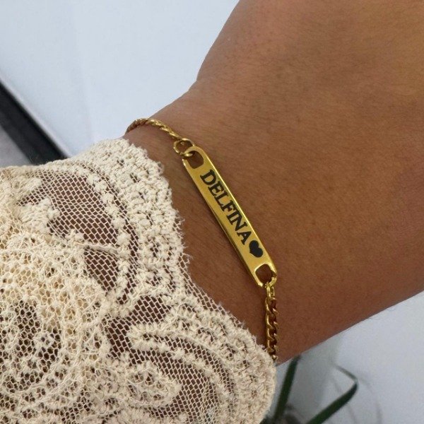 Pulsera fina estilo identidad, confeccionada en acero dorado con cadena eslabón Fígaro. Su diseño delicado y clásico la hace ideal para usar todos los días, sola o combinada con otras pulseras. La chapa central permite personalizarla con el nombre, palabra o fecha que elijas.